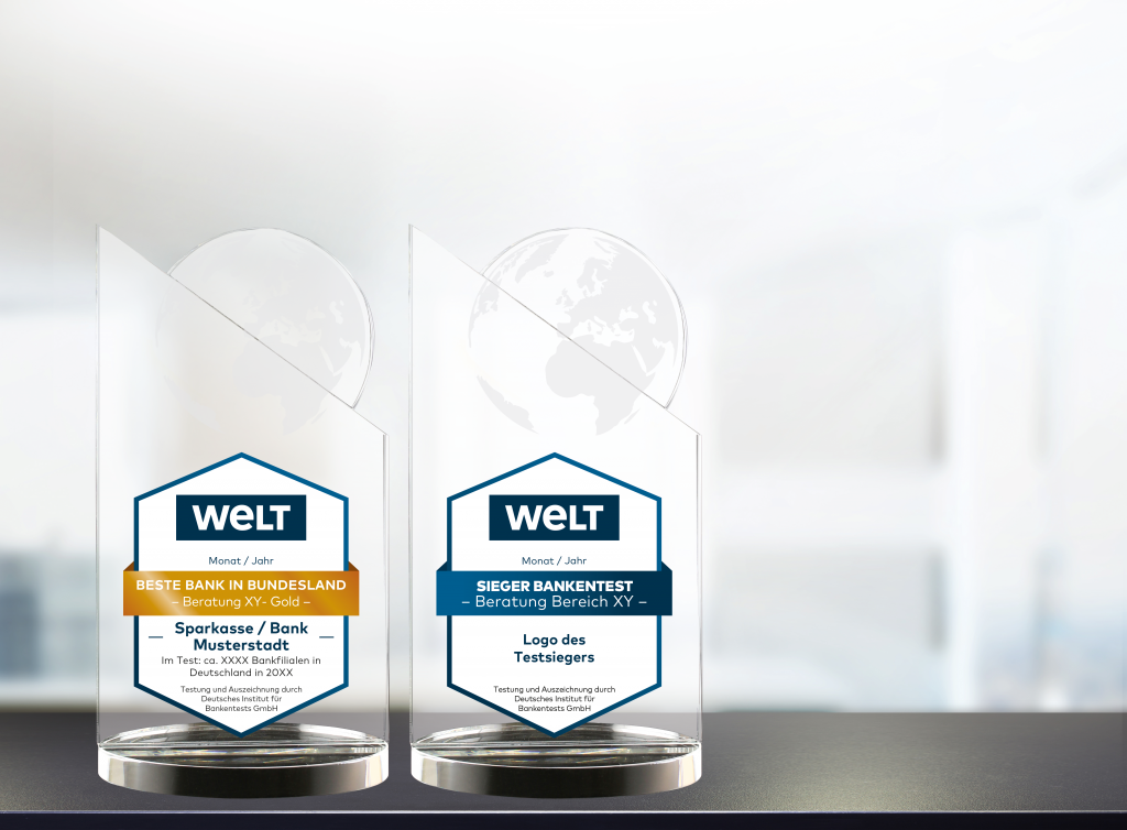 Die Kristallglas-Trophäe (Siegerpokal) mit der original WELT-Kugel und dem aufgedruckten WELT-Siegel bietet sich als Prestige-Präsentations-Trophäe an. In jeder Filiale und auf Schreibtischen ist sie der Anziehungspunkt für das Auge des Betrachters. Fotos mit Vorstand, Führungskräften und Mitarbeiterinnen und Mitarbeitern sind beliebt und können in der Werbung und Information exzellent eingesetzt werden.